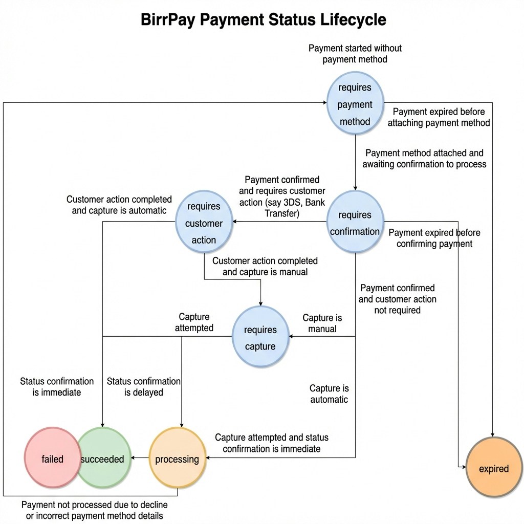 BirrPay handles the complex functionality of a comprehensive payments flow through the Payments object that transitions through multiple states during its payments lifecycle. Given below are the various statuses a payment can have:| Payment Status | Description |