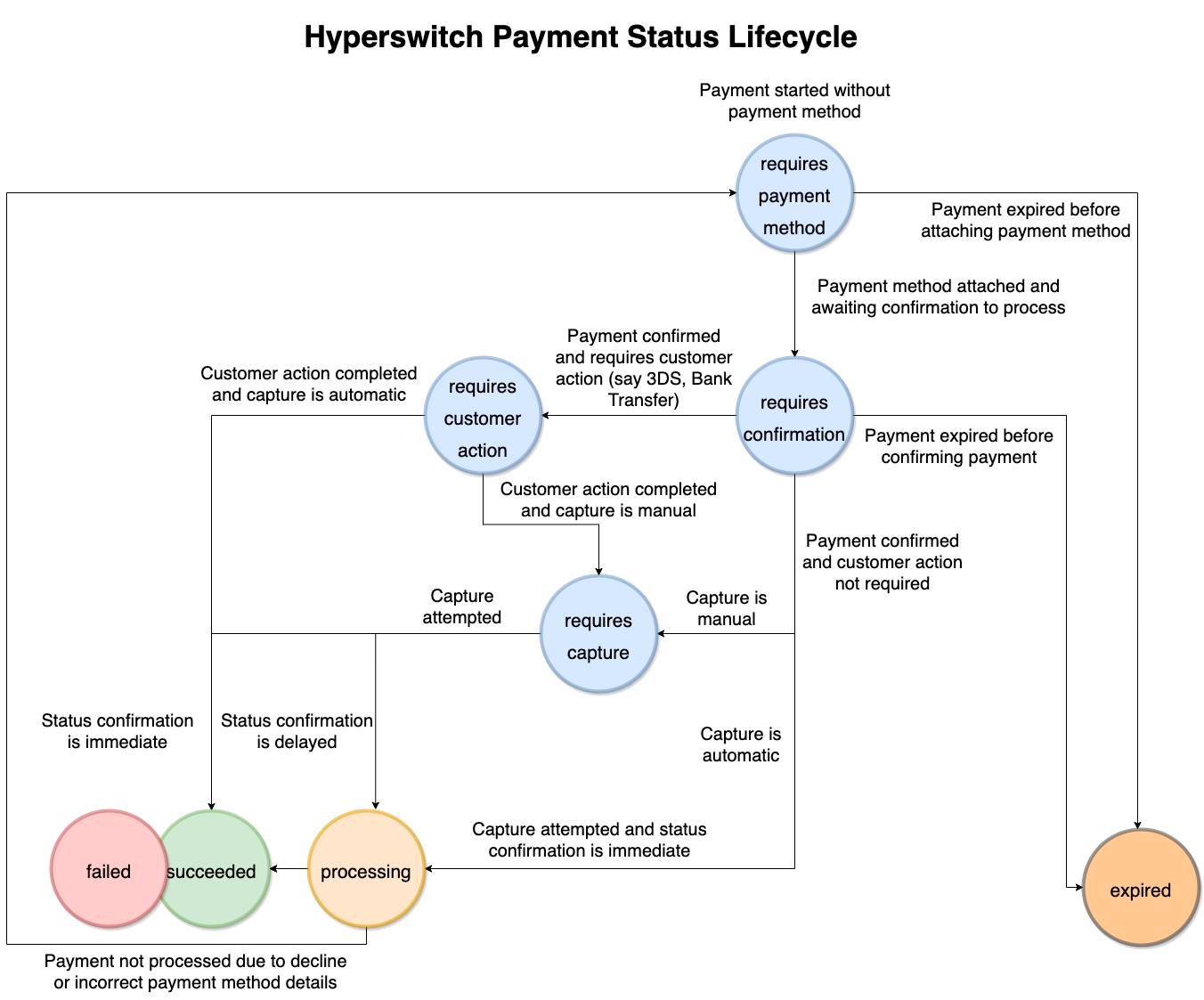 Hyperswitch handles the complex functionality of a comprehensive payments flow through the Payments object that transitions through multiple states during its payments lifecycle. Given below are the various statuses a payment can have: